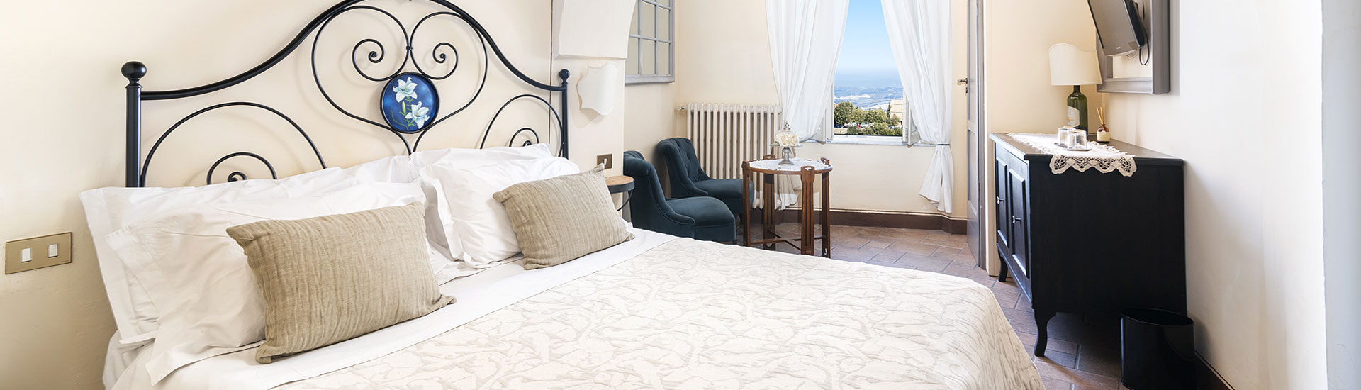 Le camere sono appena 12, con una vista bellissima sulla campagna circostante, la stessa di cui si può godere dalla saletta delle colazioni.